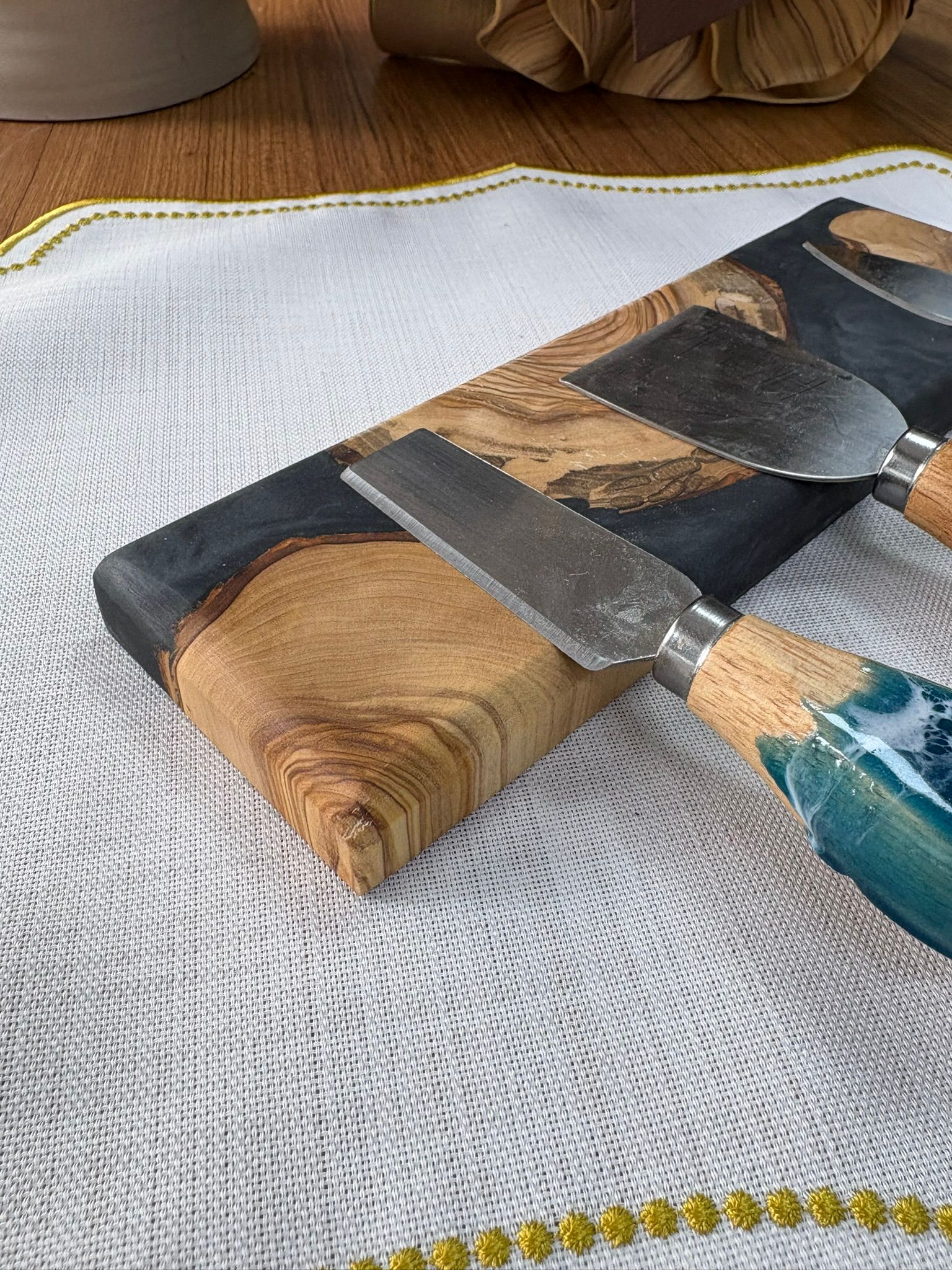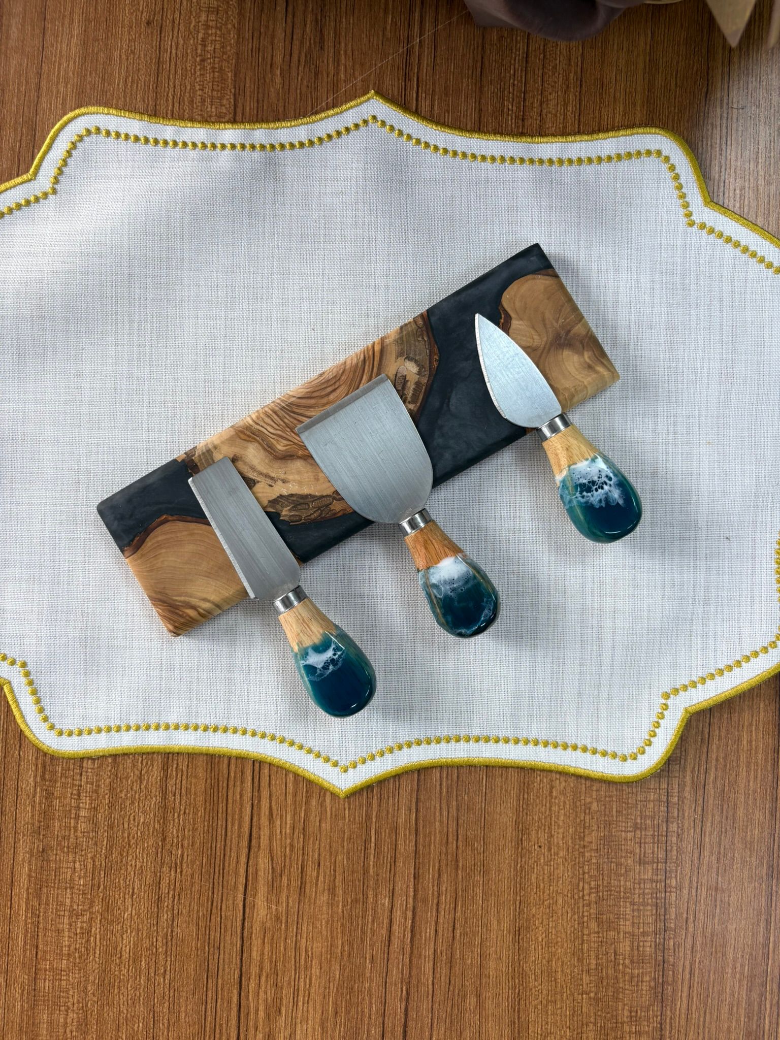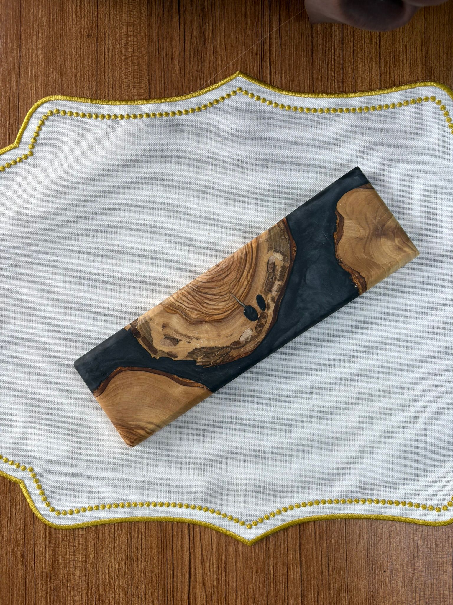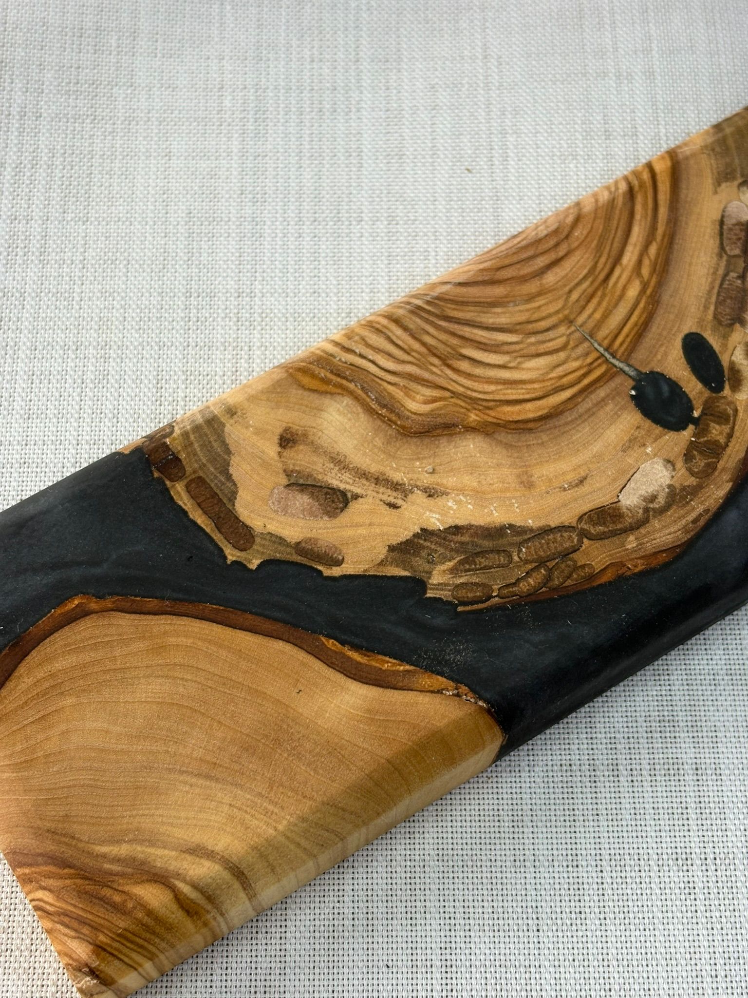 Ürünlerimiz tamamen el yapımıdır ve doğal zeytin ağacı ile yüksek kaliteli epoksi reçine ve premium pigmentlerin birleşimiyle üretilmiştir. Zeytin ağacının doğal dokusu sayesinde her bir ürün benzersizdir. Bu nedenle servis tabağı, sunum tahtası veya mutfak dekoru olarak mükemmel bir seçimdir.