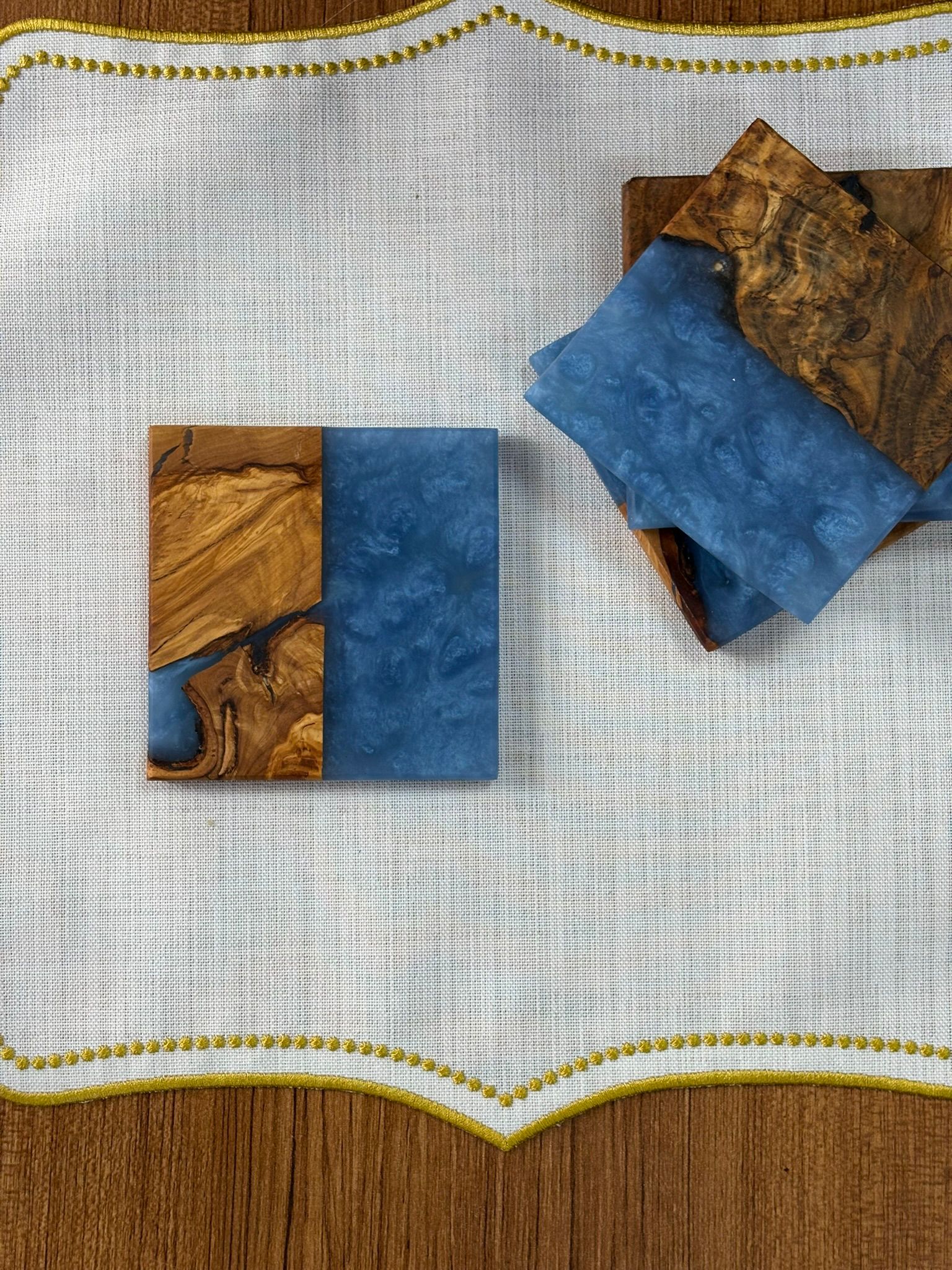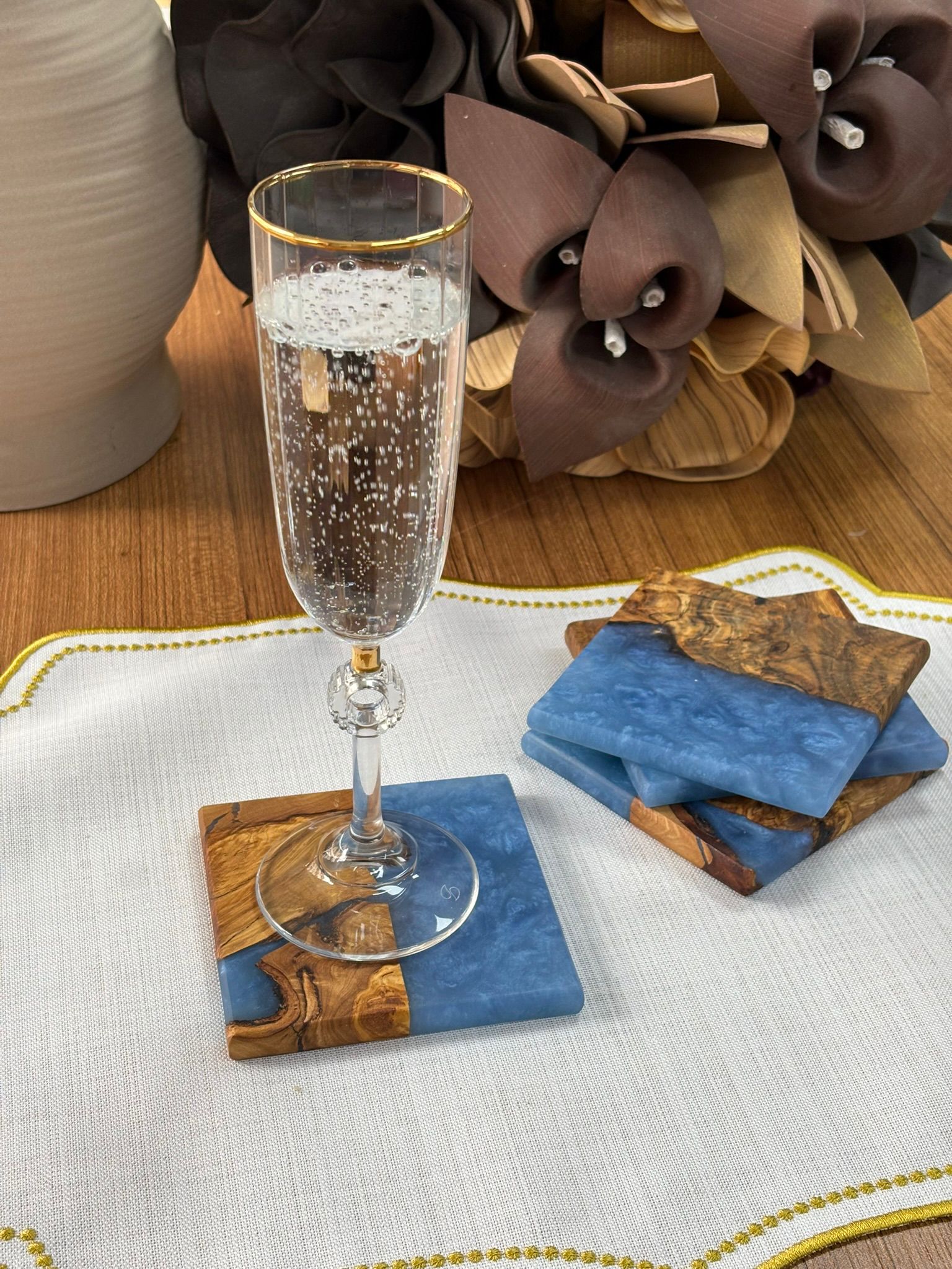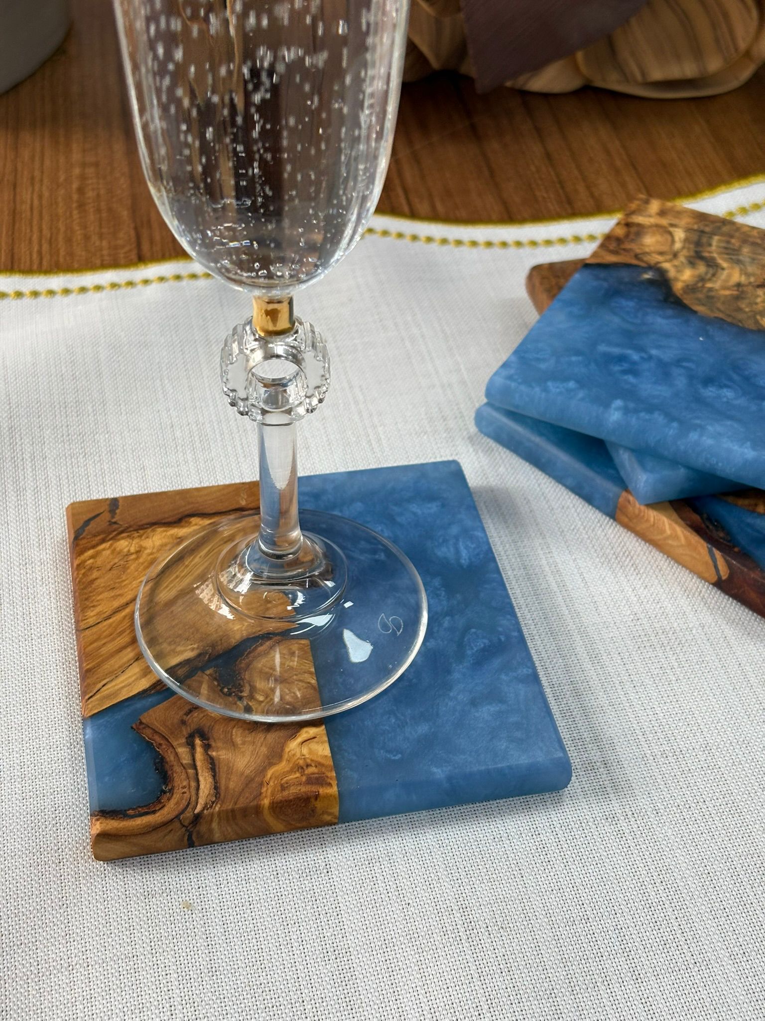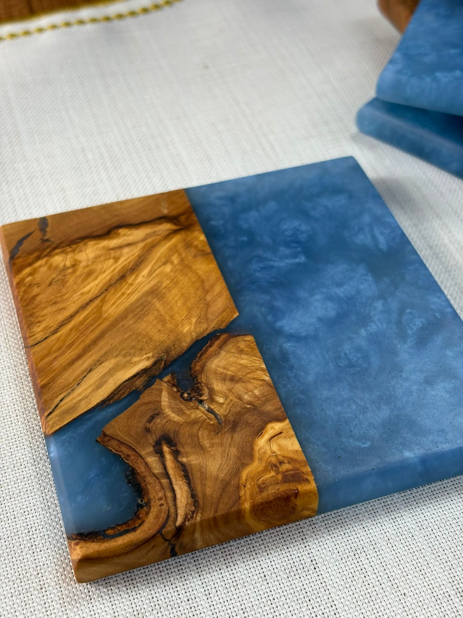 Doğal Efektli Kare Epoksi Bardak Altlığı / Mavi