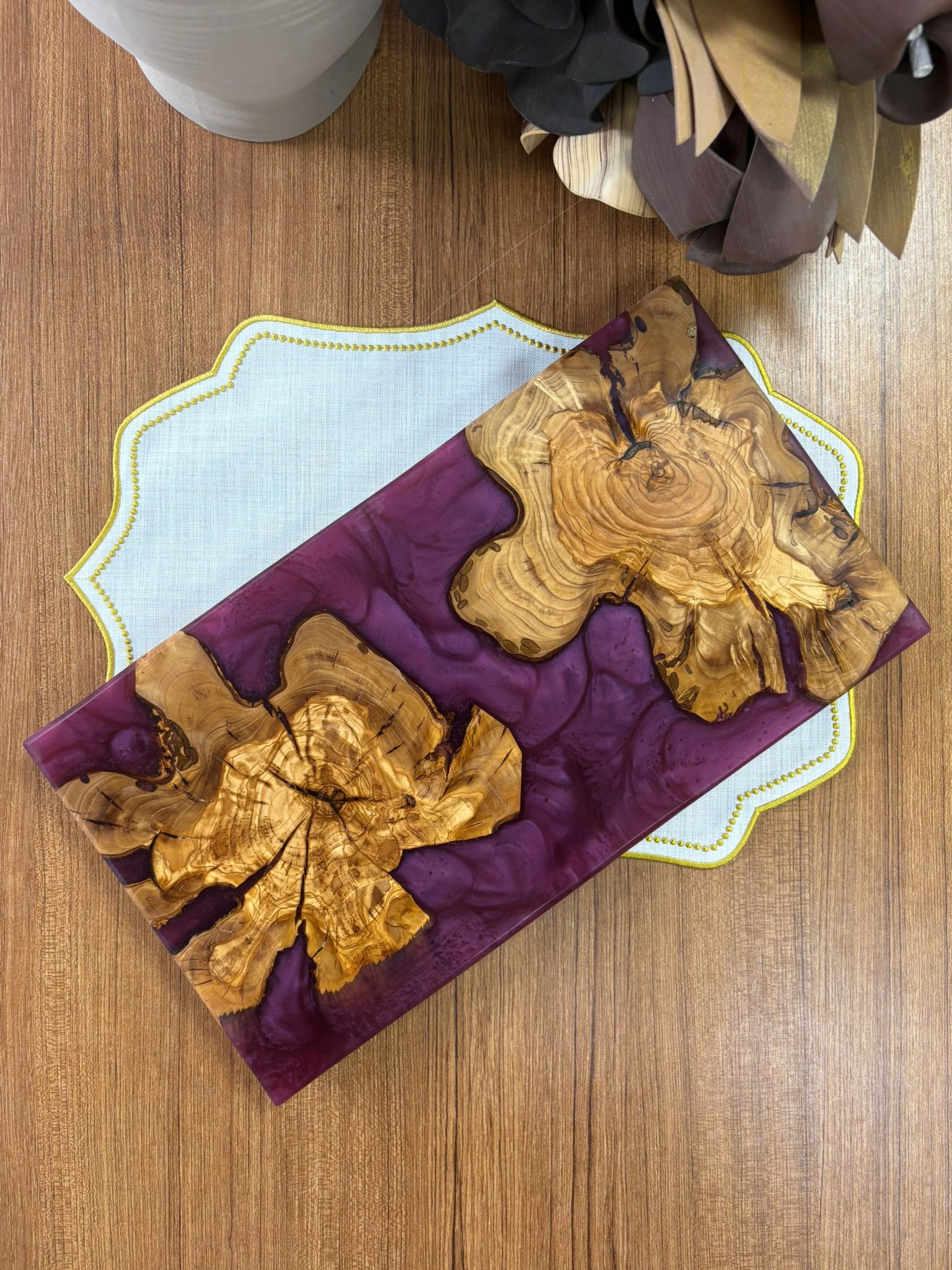 Ürünlerimiz tamamen el yapımıdır ve doğal zeytin ağacı ile yüksek kaliteli epoksi reçine ve premium pigmentlerin birleşimiyle üretilmiştir. Zeytin ağacının doğal dokusu sayesinde her bir ürün benzersizdir. Bu nedenle servis tabağı, sunum tahtası veya mutfak dekoru olarak mükemmel bir seçimdir.