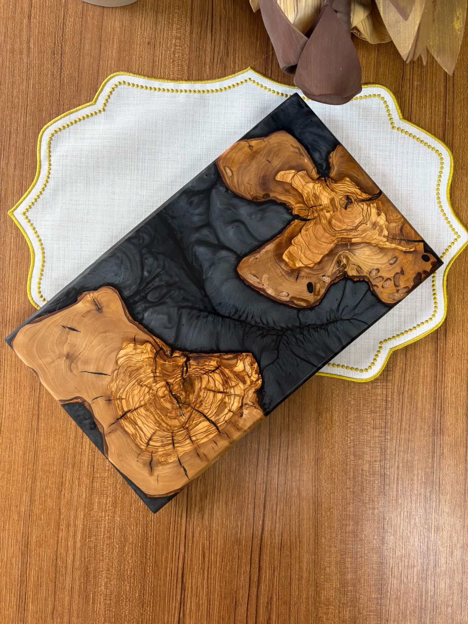 Ürünlerimiz tamamen el yapımıdır ve doğal zeytin ağacı ile yüksek kaliteli epoksi reçine ve premium pigmentlerin birleşimiyle üretilmiştir. Zeytin ağacının doğal dokusu sayesinde her bir ürün benzersizdir. Bu nedenle servis tabağı, sunum tahtası veya mutfak dekoru olarak mükemmel bir seçimdir.