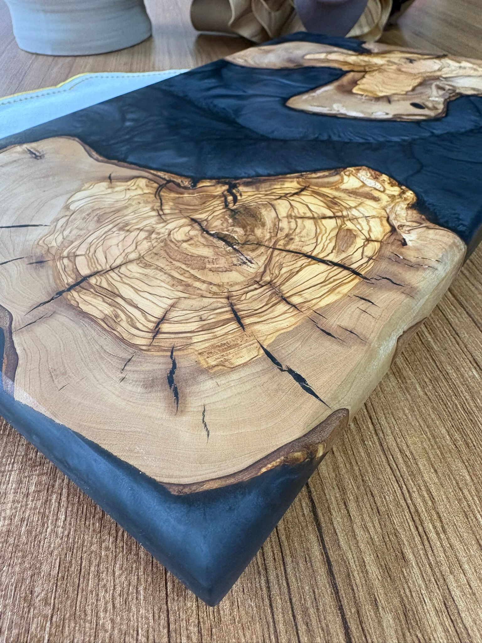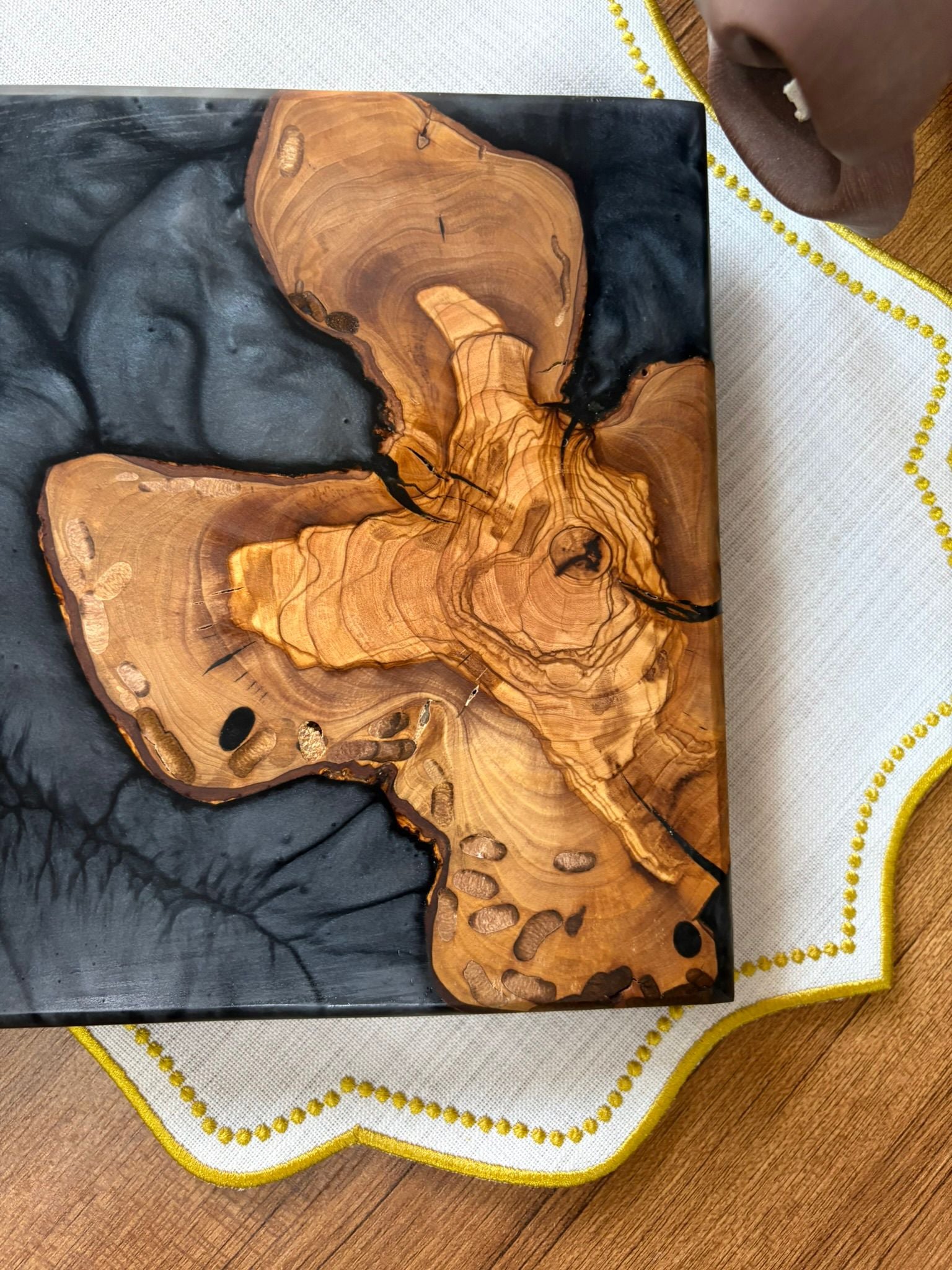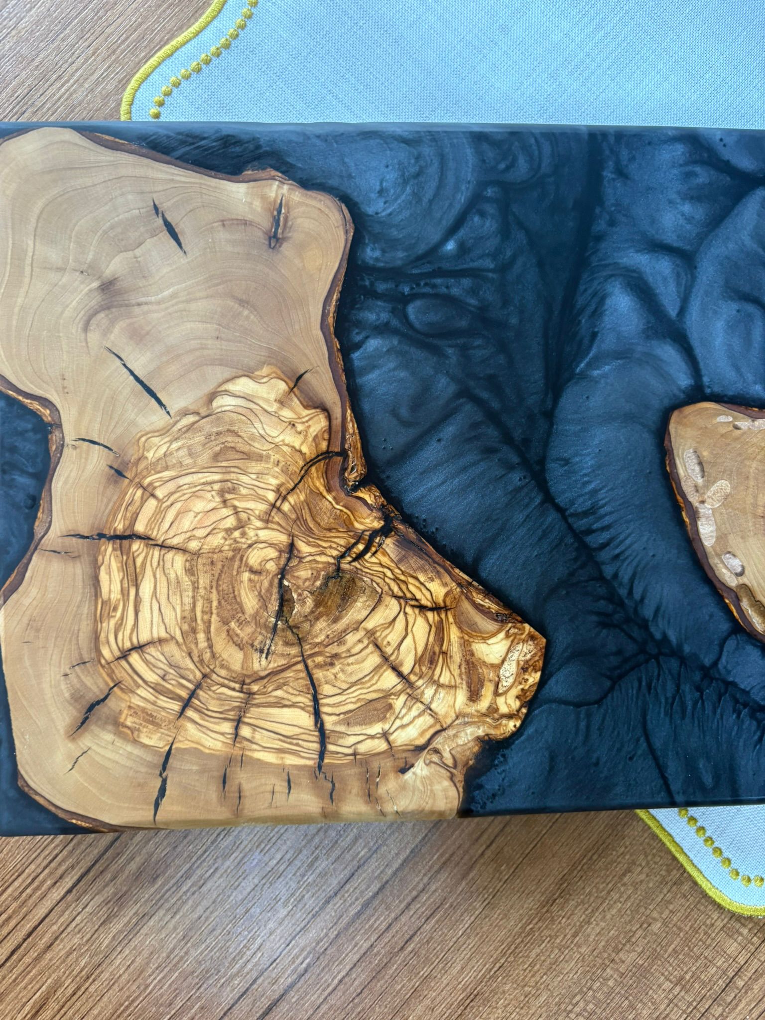 Ürünlerimiz tamamen el yapımıdır ve doğal zeytin ağacı ile yüksek kaliteli epoksi reçine ve premium pigmentlerin birleşimiyle üretilmiştir. Zeytin ağacının doğal dokusu sayesinde her bir ürün benzersizdir. Bu nedenle servis tabağı, sunum tahtası veya mutfak dekoru olarak mükemmel bir seçimdir.