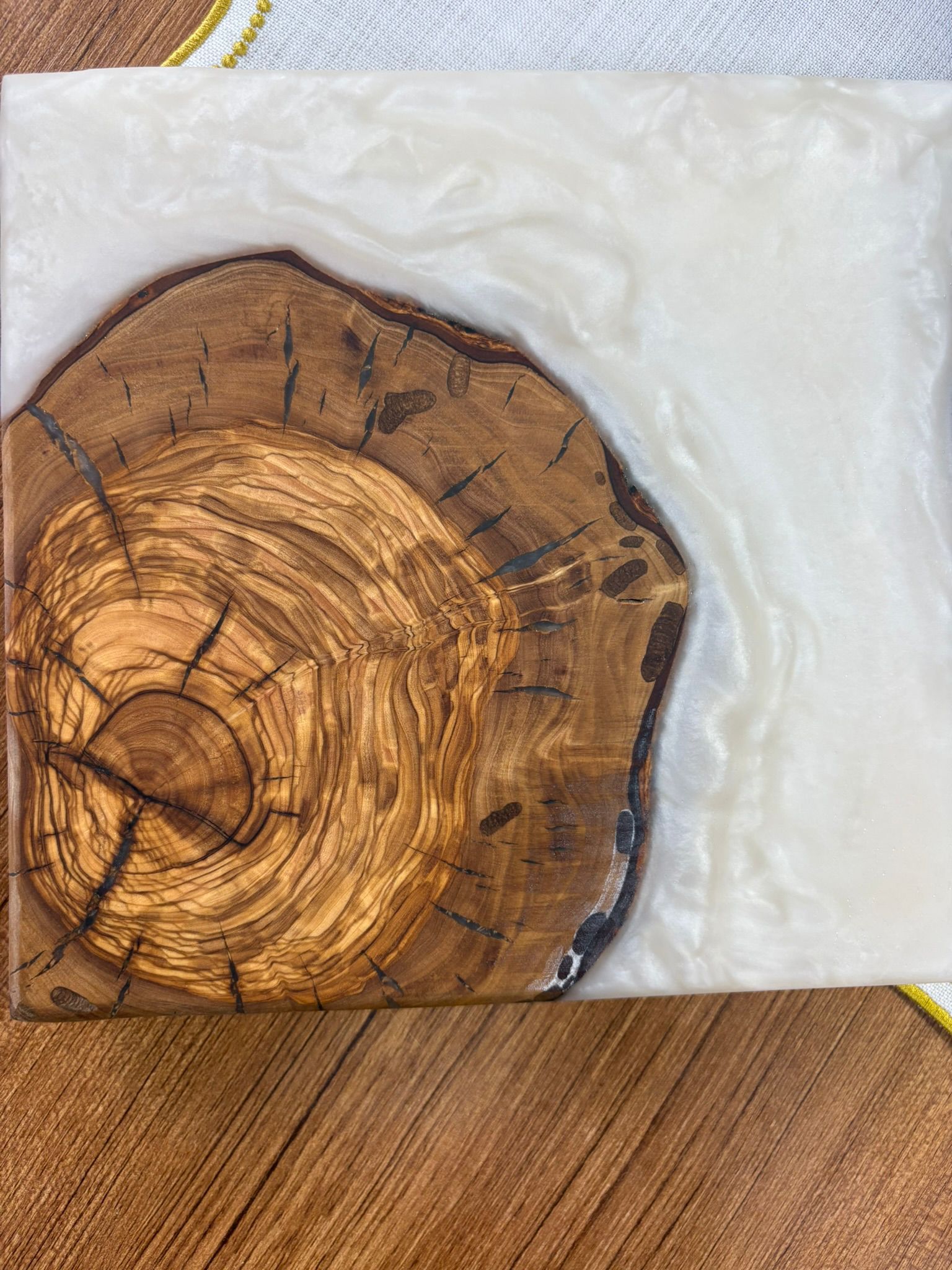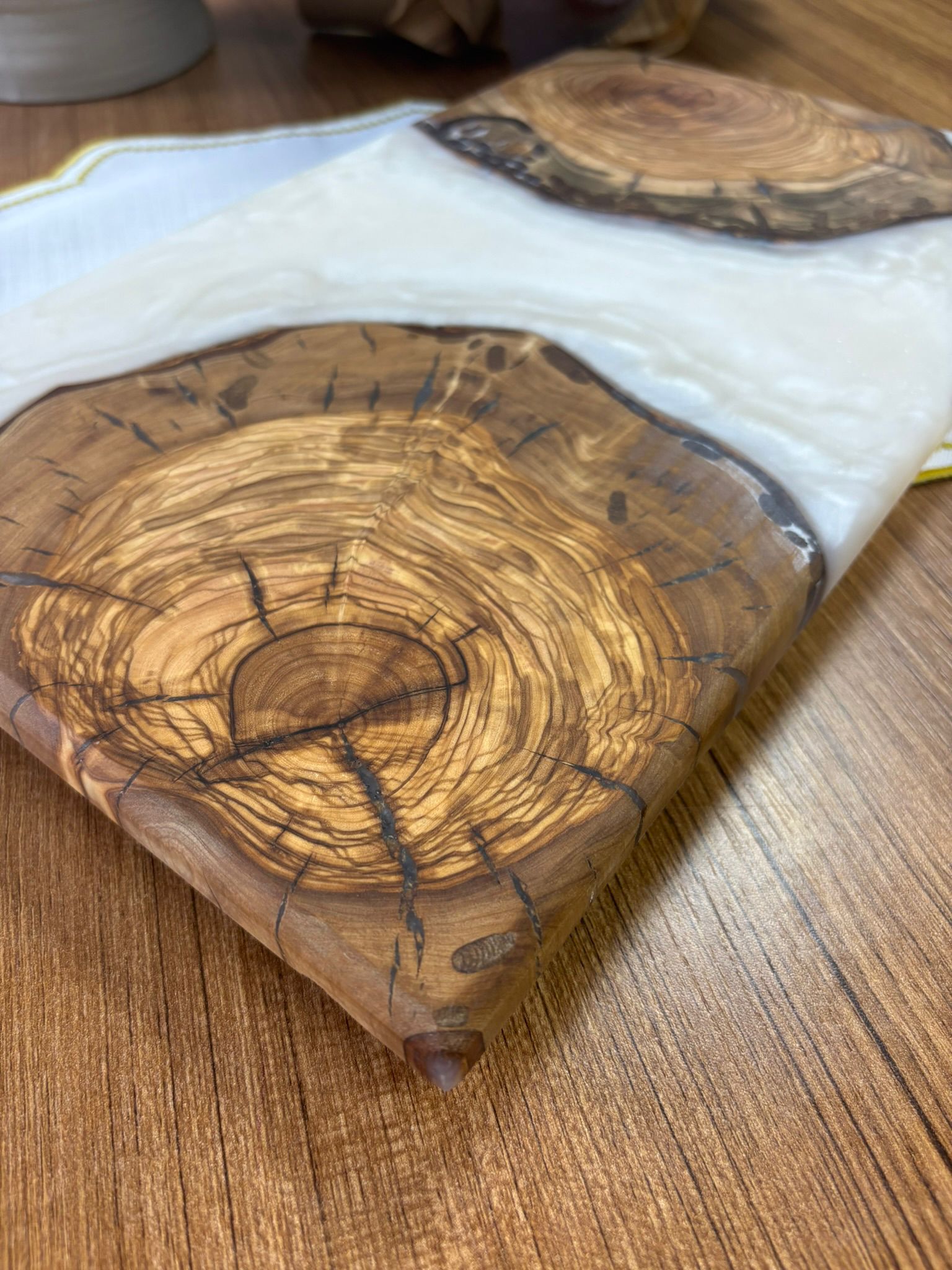 Ürünlerimiz tamamen el yapımıdır ve doğal zeytin ağacı ile yüksek kaliteli epoksi reçine ve premium pigmentlerin birleşimiyle üretilmiştir. Zeytin ağacının doğal dokusu sayesinde her bir ürün benzersizdir. Bu nedenle servis tabağı, sunum tahtası veya mutfak dekoru olarak mükemmel bir seçimdir.