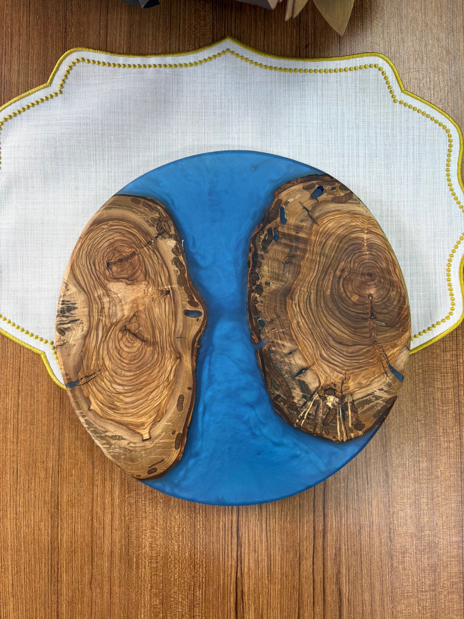 Doğal Efektli Yuvarlak Epoksi Sunumluk / Mavi / Orta Sunumluk /Servis