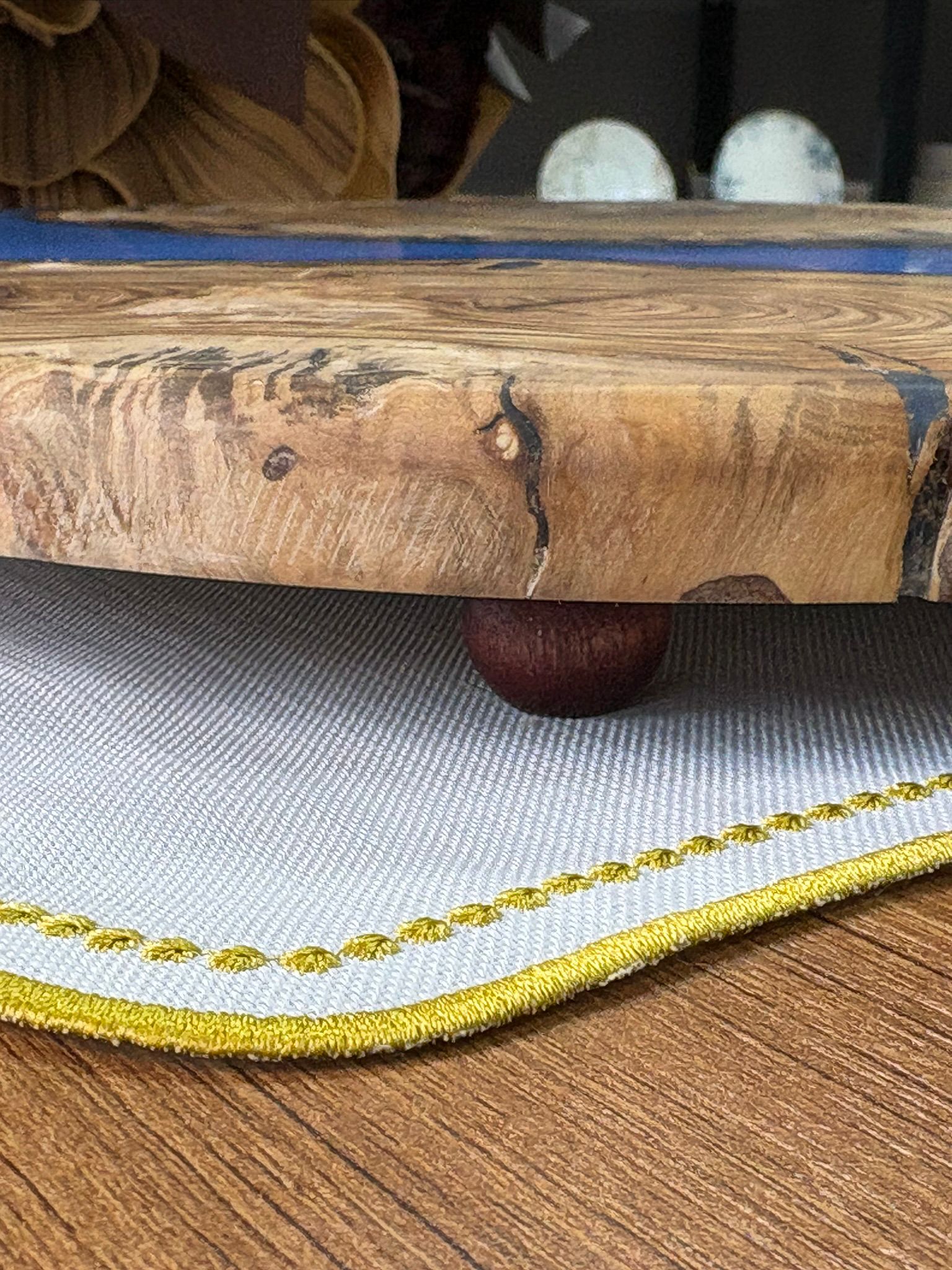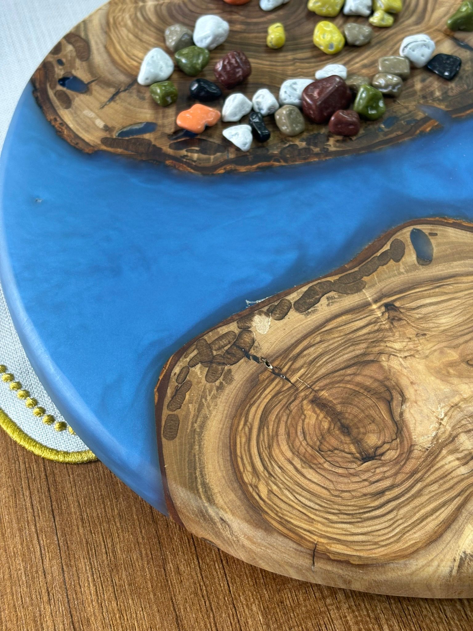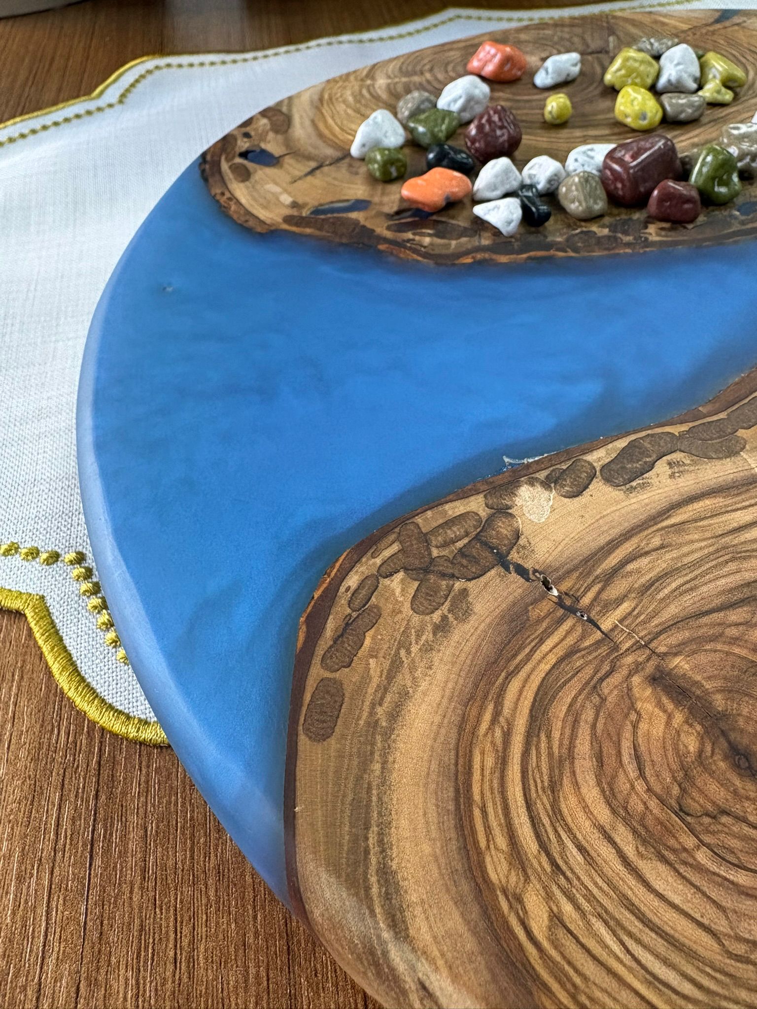Ürünlerimiz tamamen el yapımıdır ve doğal zeytin ağacı ile yüksek kaliteli epoksi reçine ve premium pigmentlerin birleşimiyle üretilmiştir. Zeytin ağacının doğal dokusu sayesinde her bir ürün benzersizdir. Bu nedenle servis tabağı, sunum tahtası veya mutfak dekoru olarak mükemmel bir seçimdir.